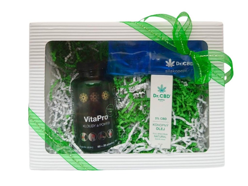 V této dárkové sadě naleznete balení 80 tobolek VitaPro klouby a pohyb, 5% CBD kapky, termo polštářek. Ideální volba pro podporu regenerace kloubů, zlepšení pohyblivosti a celkové pohody.