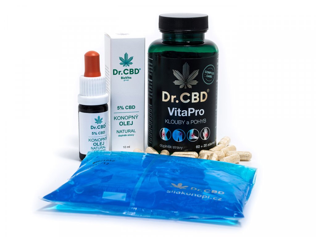 V této dárkové sadě naleznete balení 80 tobolek VitaPro klouby a pohyb, 5% CBD kapky, termo polštářek.