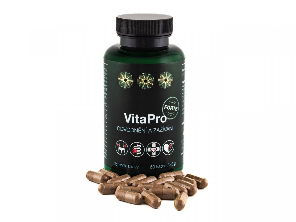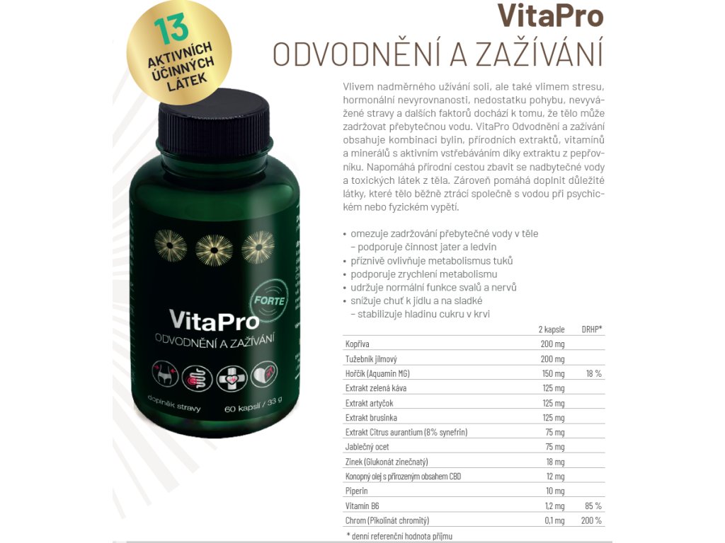 VitaPro Odvodnění a zažívání obsahuje kombinaci bylin, přírodních extraktů, vitamínů a minerálů s aktivním vstřebáváním díky extraktu z pepřovníku, které napomáhají přírodní cestou zbavit se nadbytečné vody a toxických látek z těla. Zároveň pomáhá doplnit důležité látky, které tělo běžně ztrácí společně s vodou při psychickém nebo fyzickém vypětí.